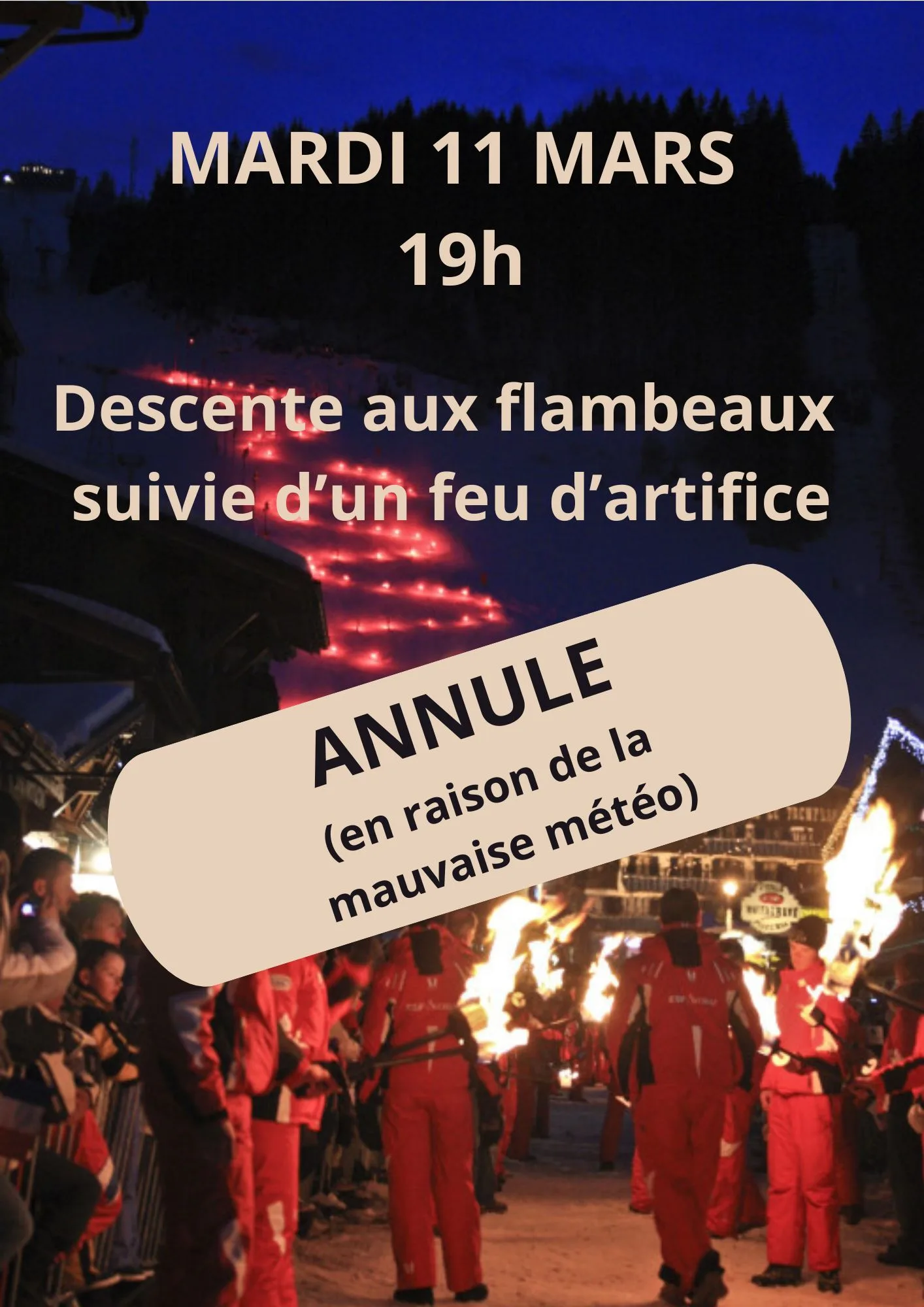 Annulée en raison des mauvaises conditions météo / Descente aux flambeaux des moniteurs de l'ESF et feu d'artifice