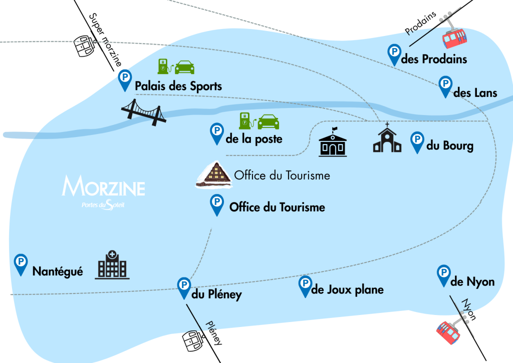 Morzine propose 10 parkings publics, dont 3 parkings souterrains au centre du village (Office de Tourisme, Pleney, Joux Plane) ainsi que plusieurs parkings extérieurs proches des remontées mécaniques et des activités.